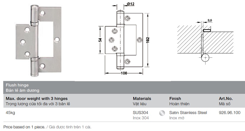 Bản lề âm dương 102x100x2.5mm inox mờ hafele 926.96.100