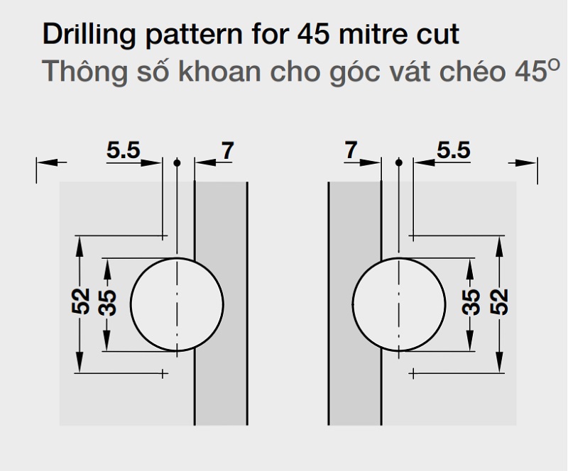 Thông số khoan lắp đặt bản lề MITRED GS 45, góc mở 135° cho góc vắt chéo 45° Hafele 325.00.708