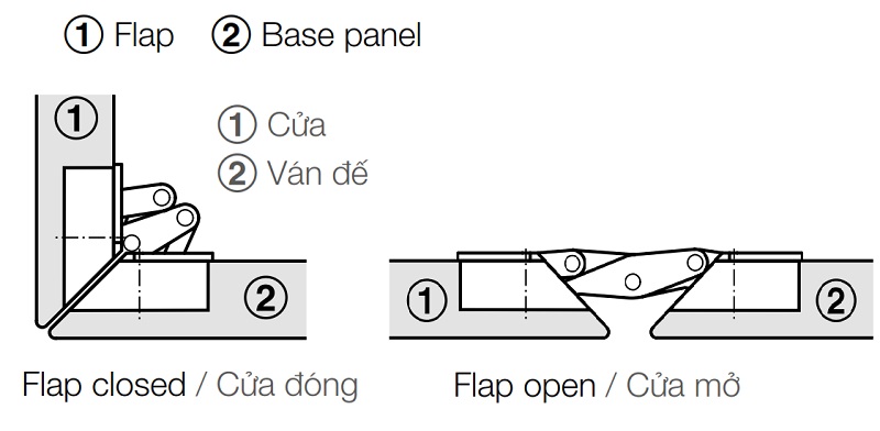 Ứng dụng bản lề cửa lật MITRED GS góc mở 95° cho góc vát chéo 45° khi cửa đóng và mở