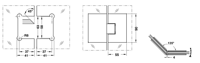Kích thước bản lề cửa phòng tắm kính – kính 135° Hafele 981.00.522