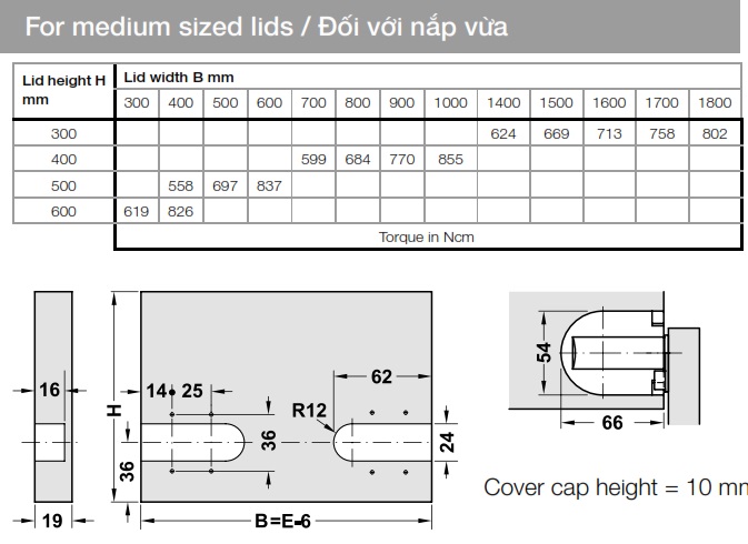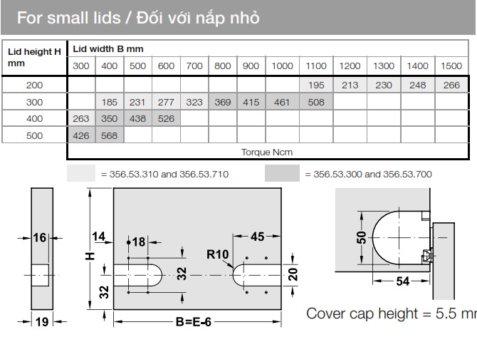 » Lưu ý: Các giá trị mômen bản lề đã tính toán được áp dụng cho các loại nắp dày bằng ván dăm với khối lượng riêng là 700 kg/m3. Khi lắp đặt thử cần có các giá trị ngưỡng và các giá trị khác.
