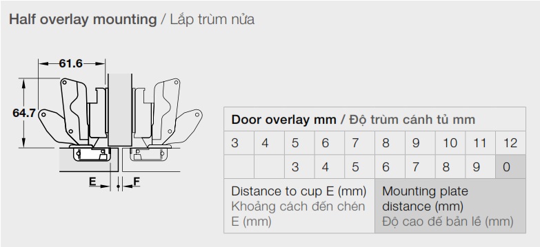 » Chiều sâu lỗ khoan chén bản lề: 12mm