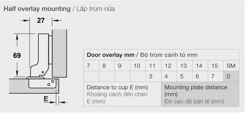 Thông số lắp đặt bản lề Metalla SM giảm chấn 95° trùm nửa cho gỗ dày màu đen Hafele 308.03.004