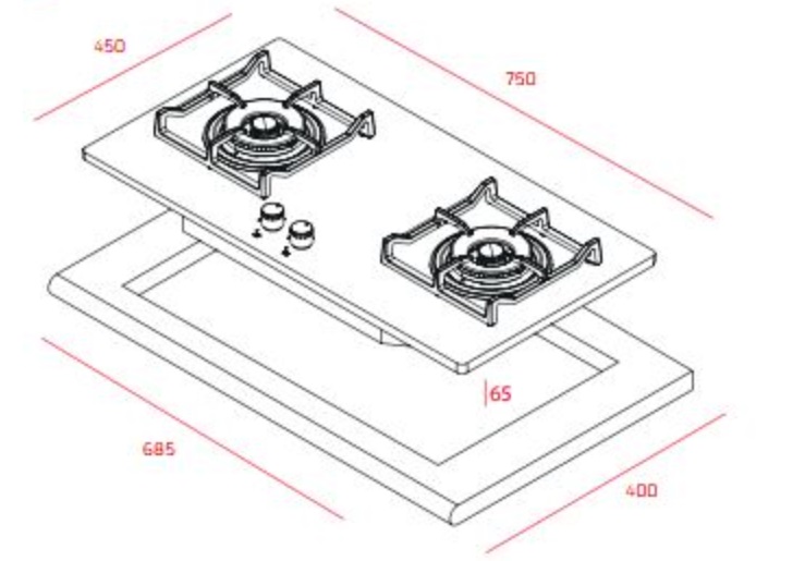 Kích thước bếp gas Teka 2 vùng nấu GVI 75 2G AI AL 2TR – R750mm
