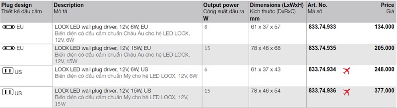 Bảng mã biến điện có đầu cắm chuẩn EU và US cho hệ Hafele LOOX 12V