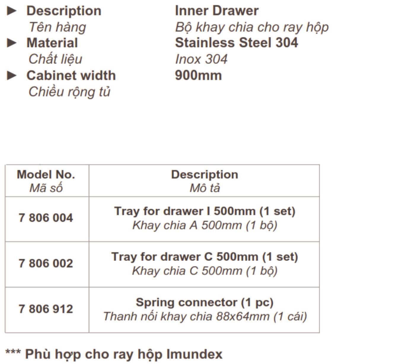 Quý Khách tham khảo bảng mã chi tiết bộ khay chia cho ray hộp 900mm Imundex 7806804: