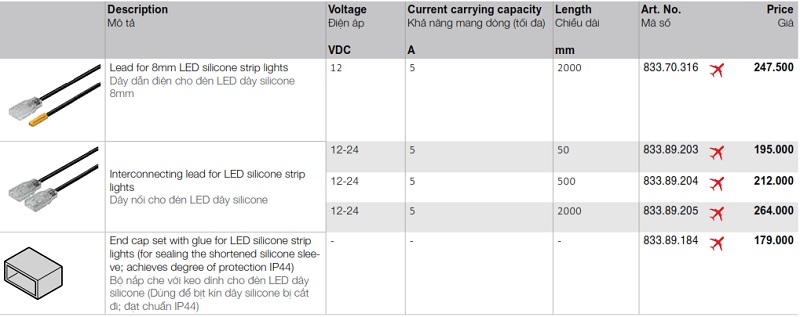 Bảng mã phụ kiện cho đèn LED dây silicon Hafele Loox5 2063 rộng 8mm