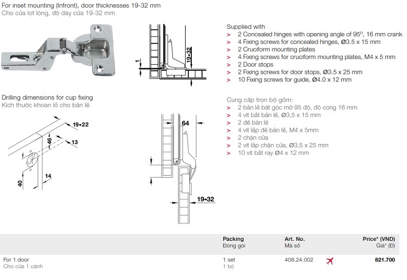 Bộ phụ kiện bản lề lọt lòng bật góc 95 độ cho 1 cánh cửa dày 19-32mm Hafele 408.24.002