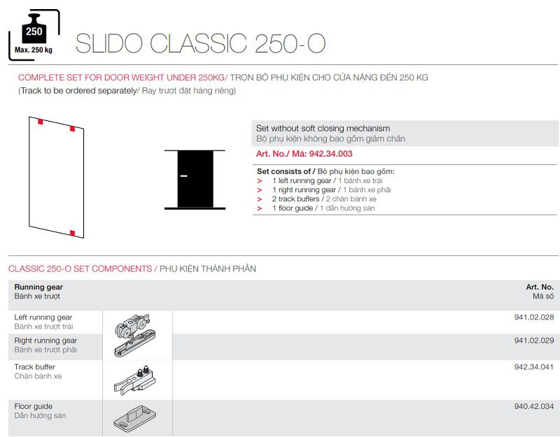 Thông số kỹ thuật bộ phụ kiện cửa trượt Classic 250-O không giảm chấn Hafele 942.34.003