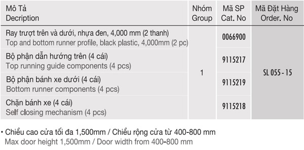 Bộ phụ kiện cửa trượt SlideLine 55 Plus 2 cánh 15kg cho cửa dày 19mm Hettich SL055-15