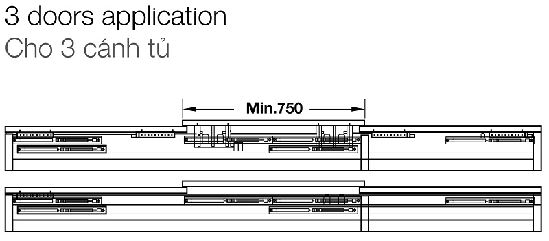 » Ứng dụng: Bộ phụ kiện cửa trượt Space Air 80 VF dùng cho tủ có cửa 2 hoặc 3 cánh, với tải trọng 80kg.
