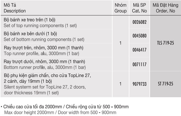 Bộ phụ kiện cửa trượt TopLine 27 cho 2 cánh 25kg cửa dày 19mm Hettich TLS719-25