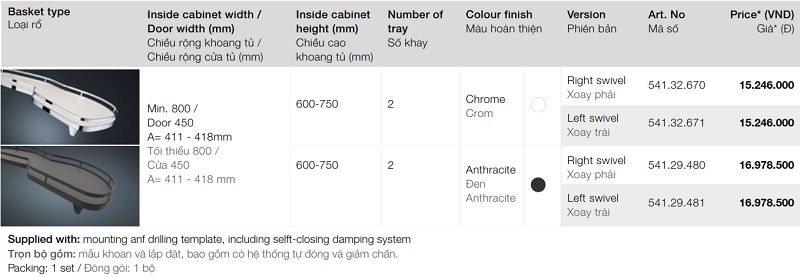 Bảng mã bộ rổ góc LeMans II với 2 khay