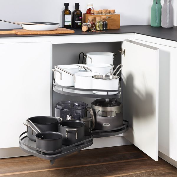 Lắp đặt bộ rổ góc LeMans II với 2 khay màu đen mở trái Hafele 541.29.481