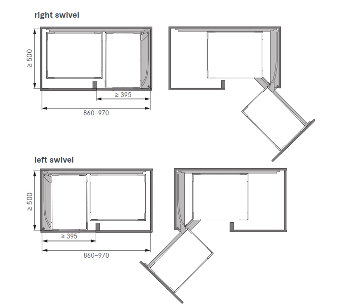 Thông số lắp đặt bộ rổ góc MagicCorner dạng lưới mở trái và mở phải Hafele