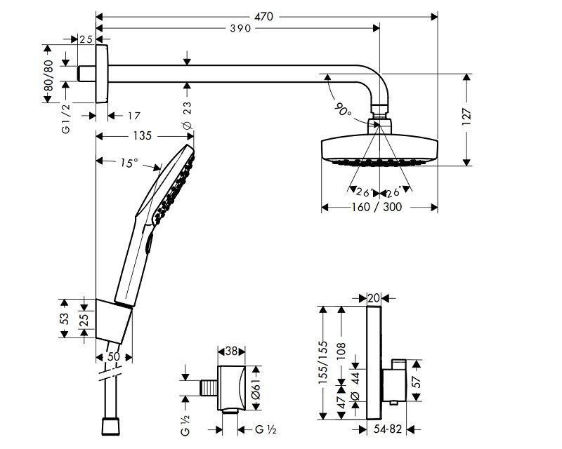 Kích thước bộ sản phẩm sen âm tắm tường Raindance Select E 589.52.634