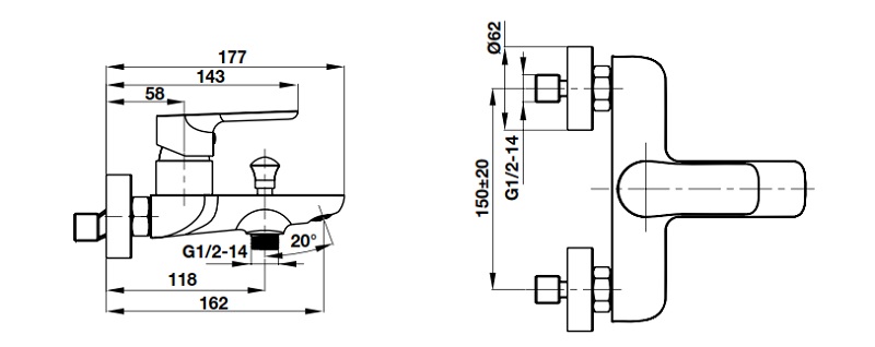 Kích thước bộ trộn bồn tắm 2 đường nước UNI lắp nổi Hafele 495.61.130