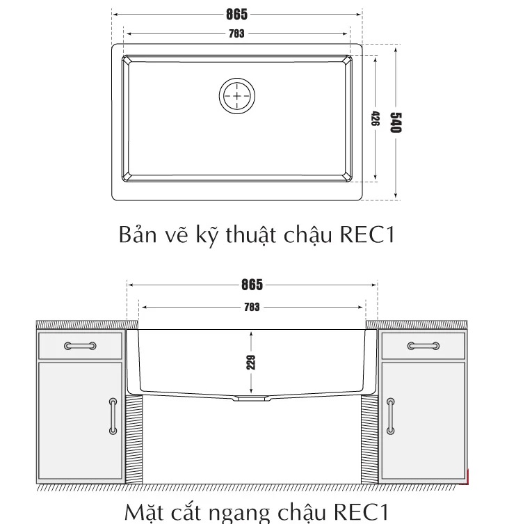 Kích thước chậu đá Carysil REC1-02 SNOVA màu trắng