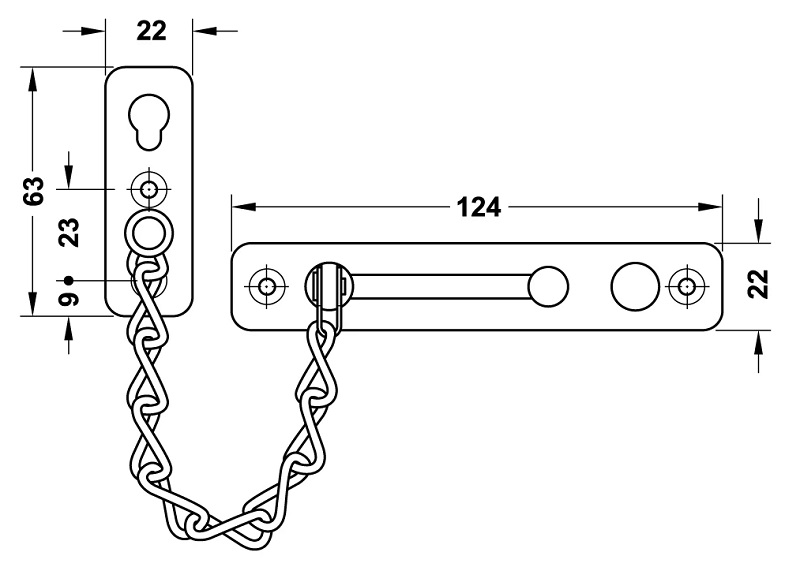 Kích thước chốt an toàn dạng xích đồng bóng Hafele 489.71.561