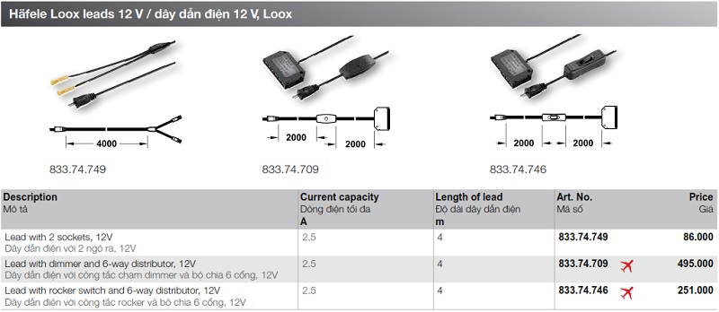 Bảng mã dây dẫn điện Hafele Loox 12V
