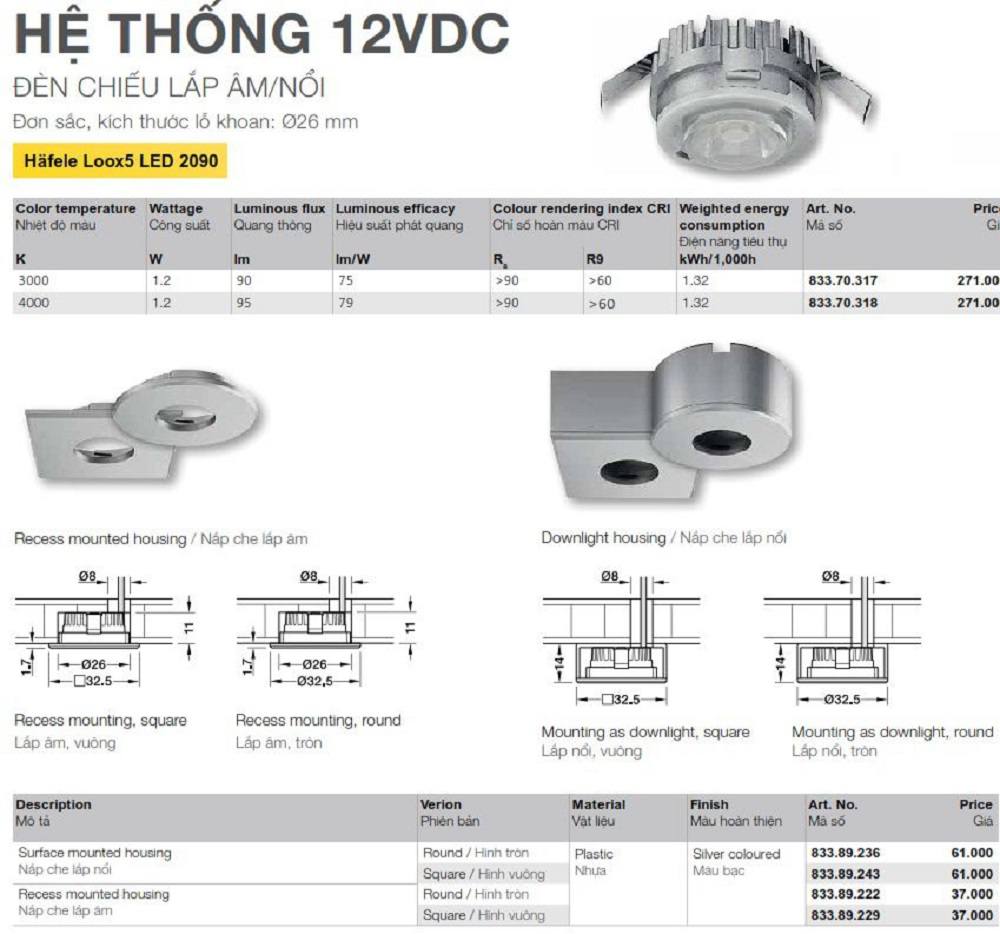 ⇒ Quí khách tham khảo bảng mã đèn chiếu Hafele Loox5 LED 2090 và phụ kiện nắp che phù hợp: