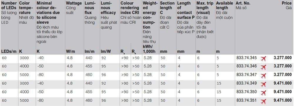 Bảng mã và thông số đèn LED dây silicone Hafele Loox5 LED 2063