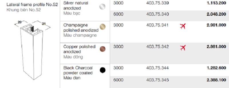 Bảng mã khung bên No.52 SLIDO ALUFLEX 80 Hafele