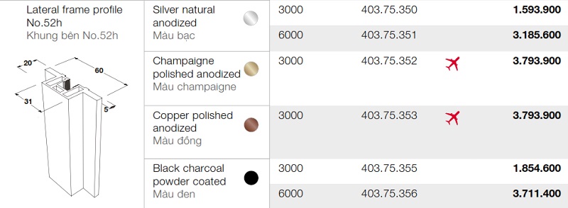 Bảng mã khung bên No.52h SLIDO ALUFLEX 80 Hafele