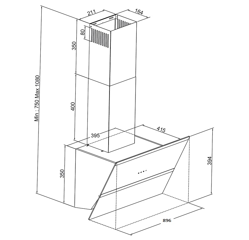 Kích thước máy hút mùi gắn tường mặt kính đen Fagor 3CFT-903N