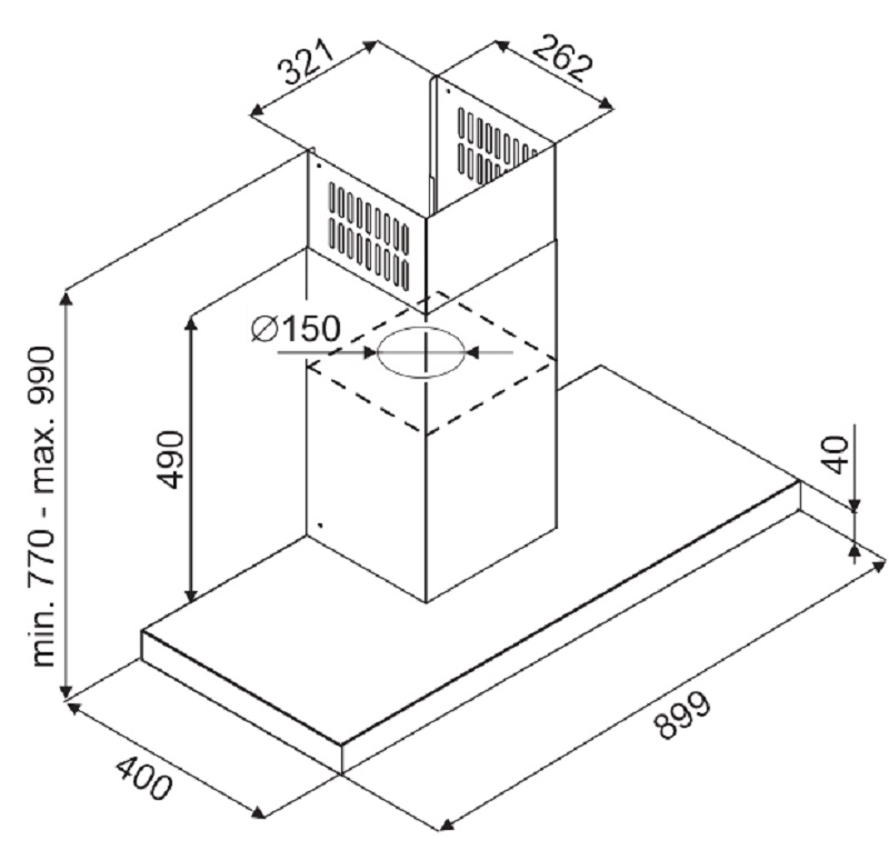 Kích thước máy hút mùi gắn tường mặt kính và inox Fagor 3CFS-9032X