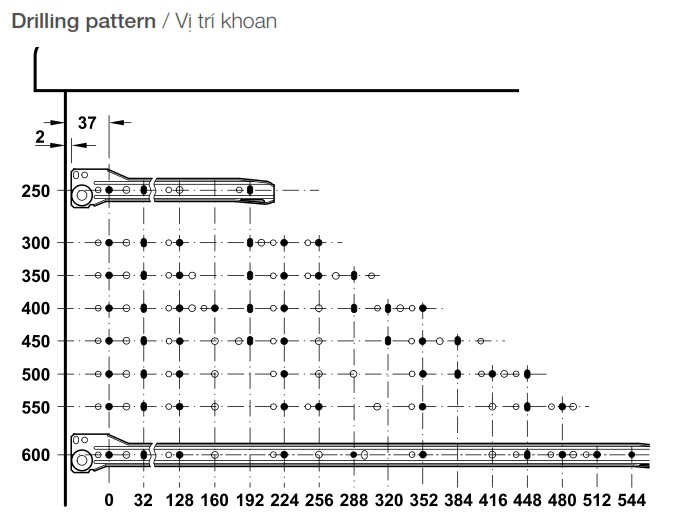 • Chiều rộng ray hộp tối đa = chiều rộng lọt lòng + 25mm
