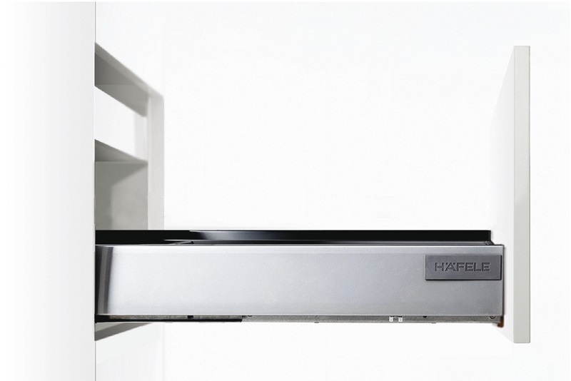 » Trọn bộ gồm: 1 cặp ray trượt mở toàn phần, 1 cặp thành hộp H84 mm, 2 bas mặt sau, 2 bas mặt trước và 2 nắp che với Häfele logo.