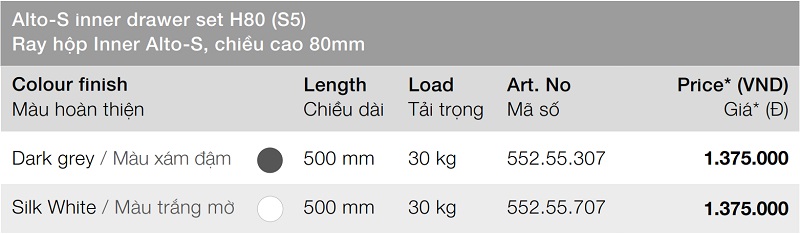 Thông số ray hộp âm ALTO-S giảm chấn H80mm xám đậm Hafele 552.55.307