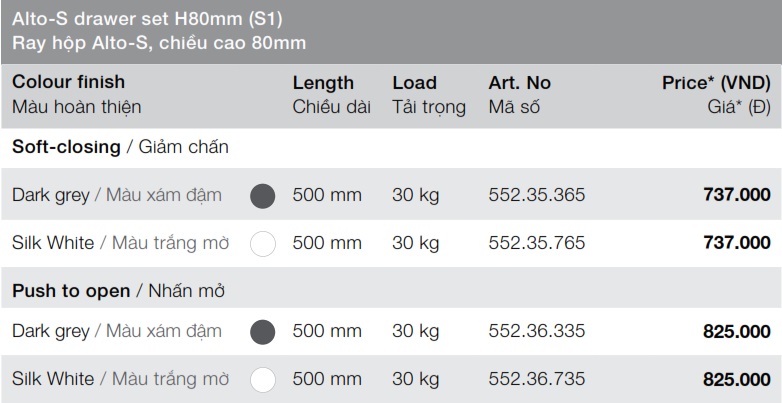 Bảng mã ray hộp Hafele Alto-S nhấn mở H80 trắng mờ 552.36.735