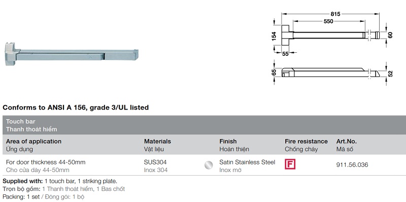 » Trọn bộ gồm: 1 Thanh thoát hiểm, 1 Bas chốt