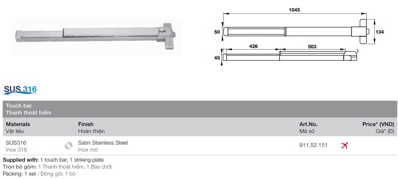 » Trọn bộ gồm: 1 Thanh thoát hiểm, 1 Bas chốt