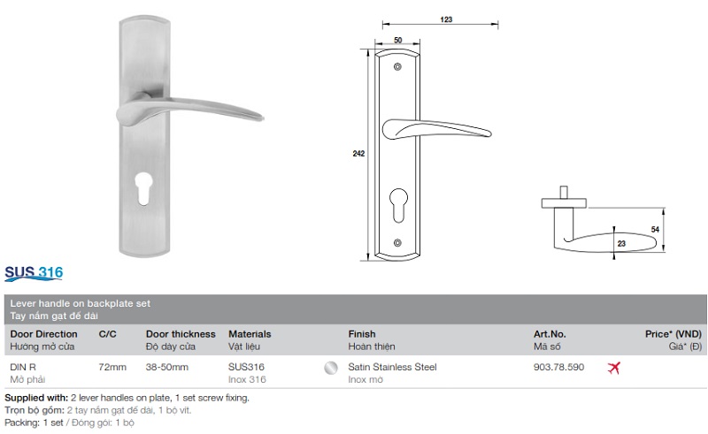» Trọn bộ gồm: 2 tay nắm gạt đế dài, 1 bộ vít
