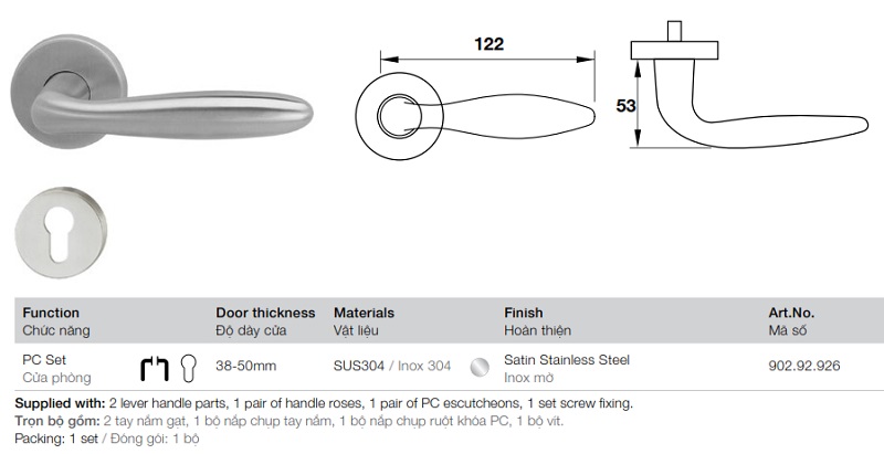 » Trọn bộ gồm: 2 tay nắm gạt, 1 bộ nắp chụp tay nắm, 1 bộ nắp chụp ruột khóa PC, 1 bộ vít.