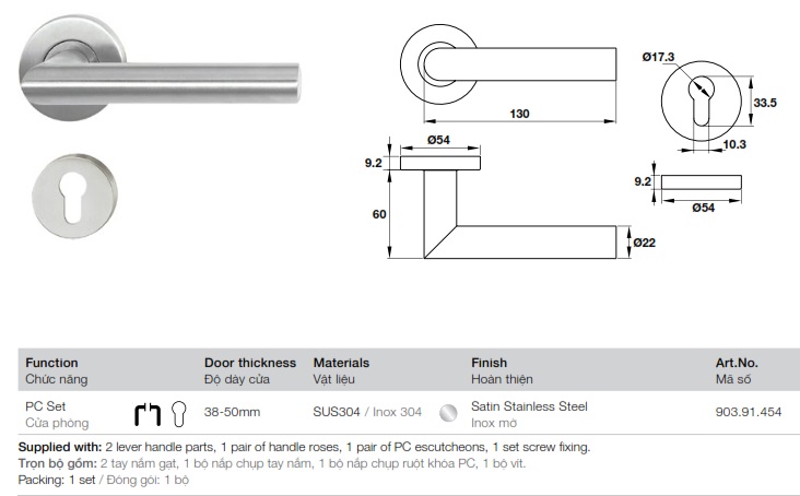 » Trọn bộ gồm: 2 tay nắm gạt, 1 bộ nắp chụp tay nắm, 1 bộ nắp chụp ruột khóa PC, 1 bộ vít.