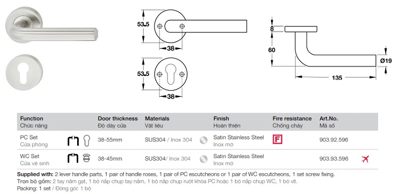 » Trọn bộ gồm: 2 tay nắm gạt, 1 bộ nắp chụp tay nắm, 1 bộ nắp chụp ruột khóa PC, 1 bộ vít.
