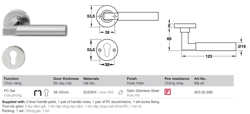 » Trọn bộ gồm: 2 tay nắm gạt, 1 bộ nắp chụp tay nắm, 1 bộ nắp chụp ruột khóa PC, 1 bộ vít.