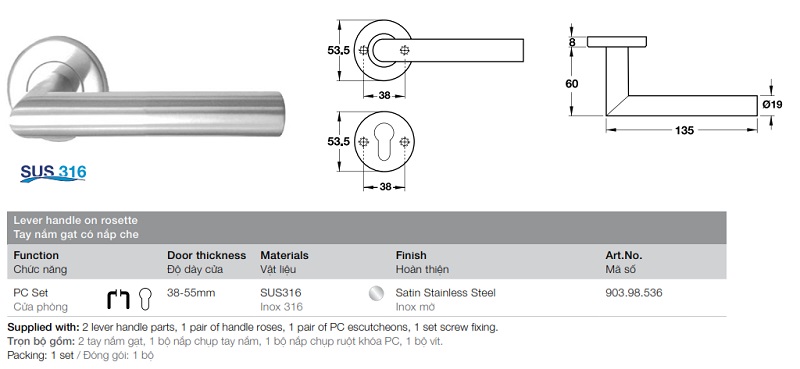 » Trọn bộ gồm: 2 tay nắm gạt, 1 bộ nắp chụp tay nắm, 1 bộ nắp chụp ruột khóa PC, 1 bộ vít.