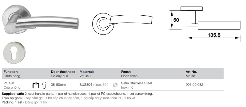 » Trọn bộ gồm: 2 tay nắm gạt, 1 bộ nắp chụp tay nắm, 1 bộ nắp chụp ruột khóa PC, 1 bộ vít.