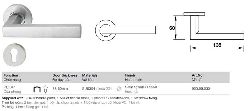 » Trọn bộ gồm: 2 tay nắm gạt, 1 bộ nắp chụp tay nắm, 1 bộ nắp chụp ruột khóa PC, 1 bộ vít.