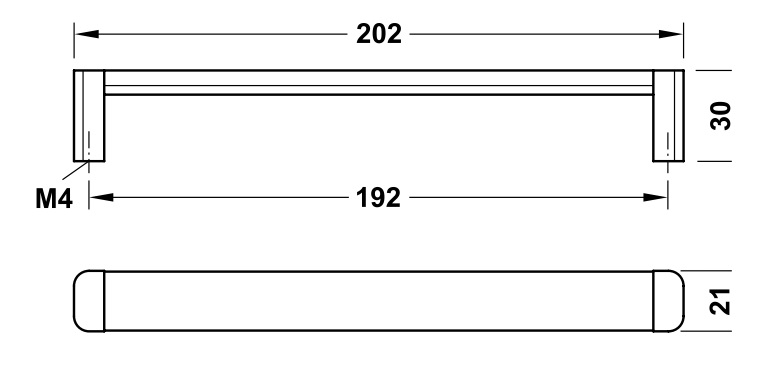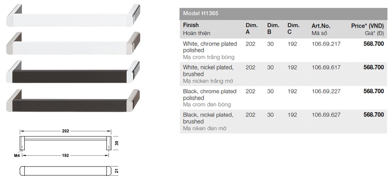Kích thước tay nắm tủ Hafele CC-192mm niken trắng mờ 106.69.617
