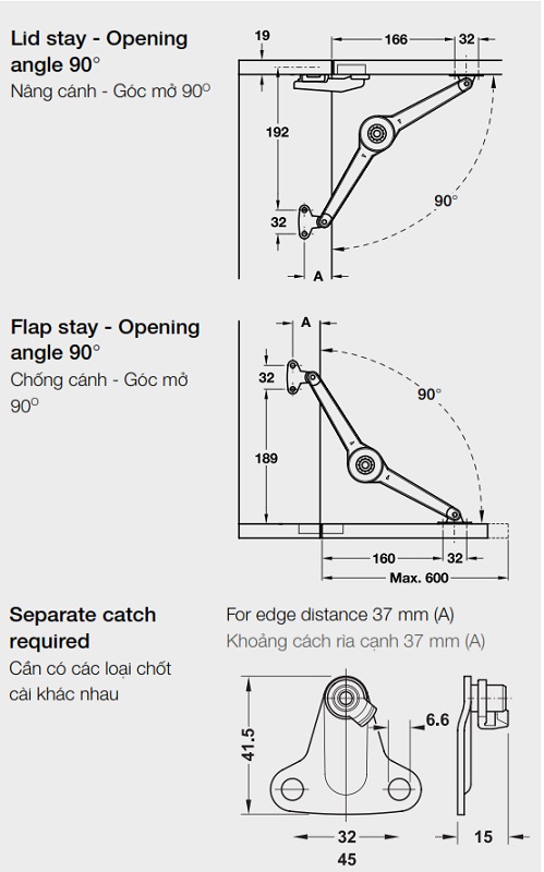 Kích thước lắp đặt tay nâng Duo Forte Hafele 373.66.612