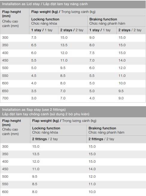 » Lắp đặt: Lắp trái hoặc phải, có thể lắp cho cánh mở lên (nâng cánh) hoặc cánh hạ xuống (chống cánh).