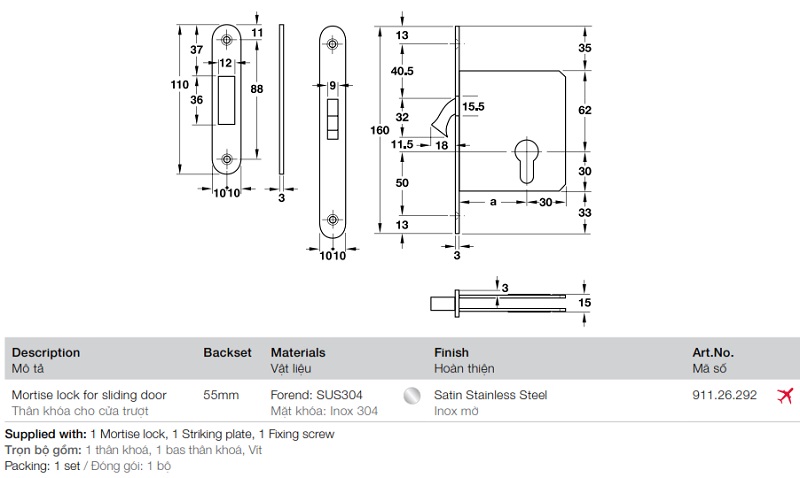 Kích thước thân khoá cho cửa trượt S55/0A Hafele 911.26.292