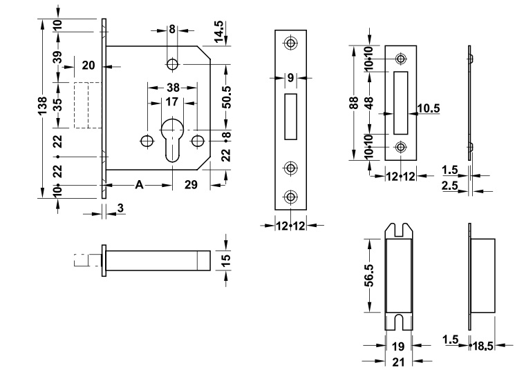 Kích thước thân khóa chốt chết inox 316 Hafele 911.22.386