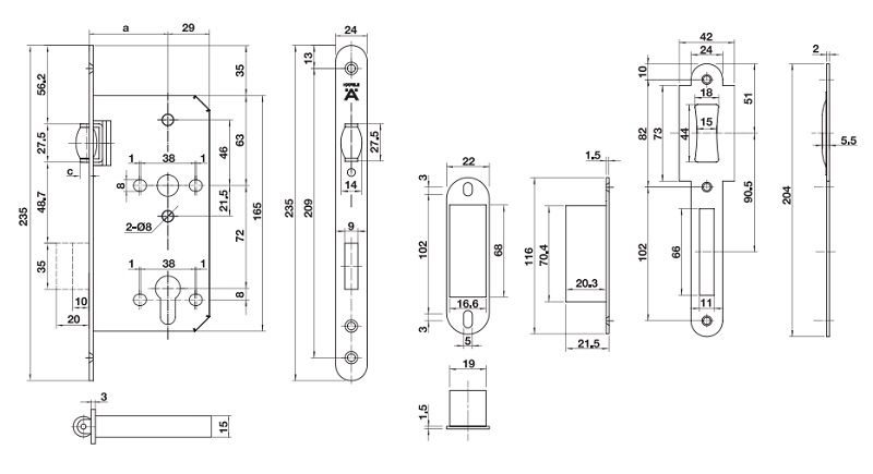 Kích thước thân khóa con lăn BS-55mm inox mờ Hafele 911.24.068